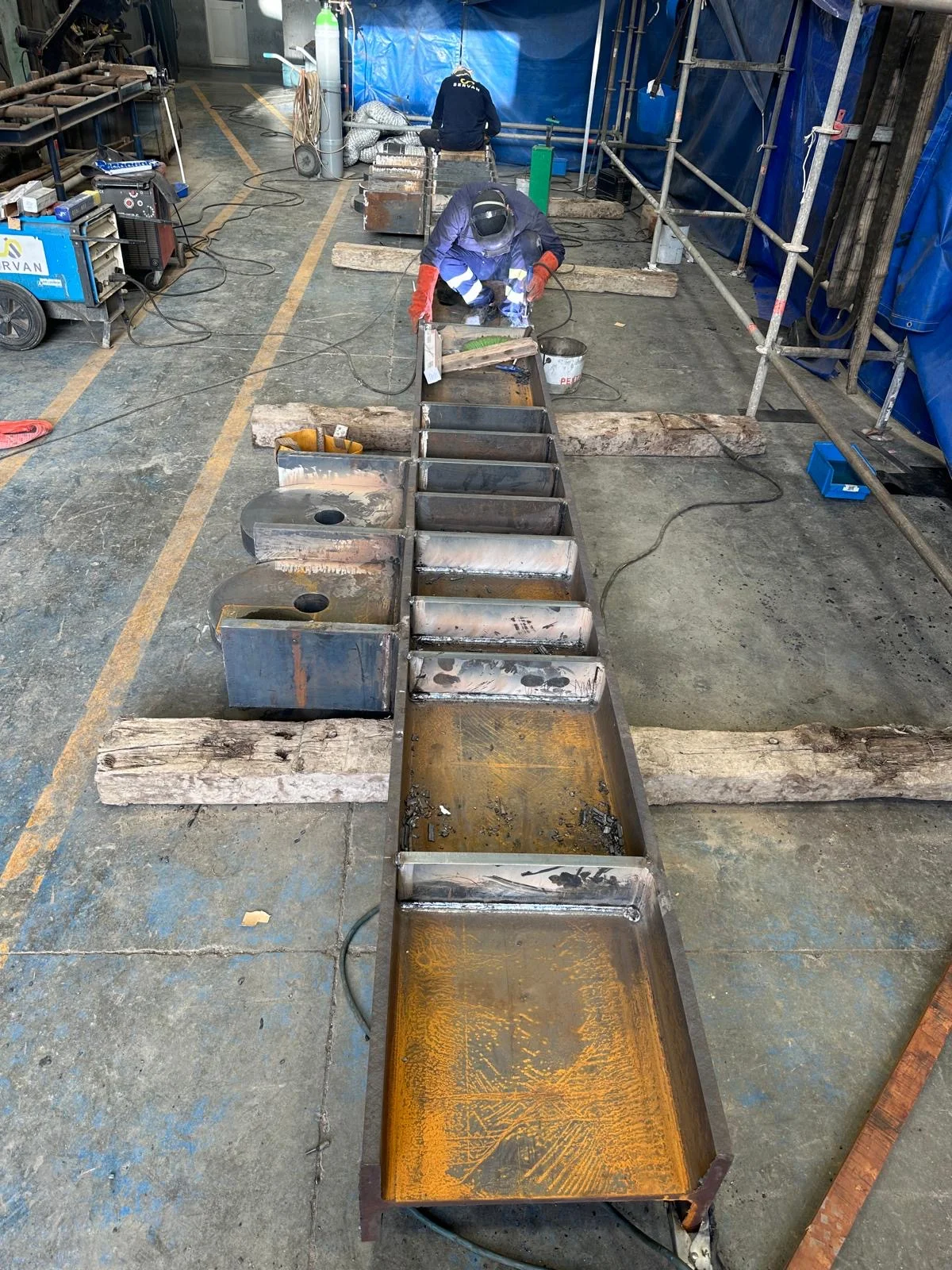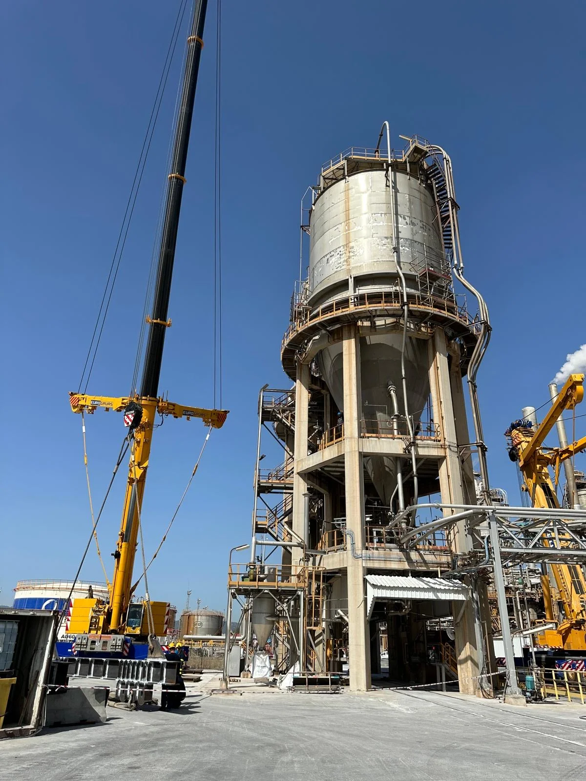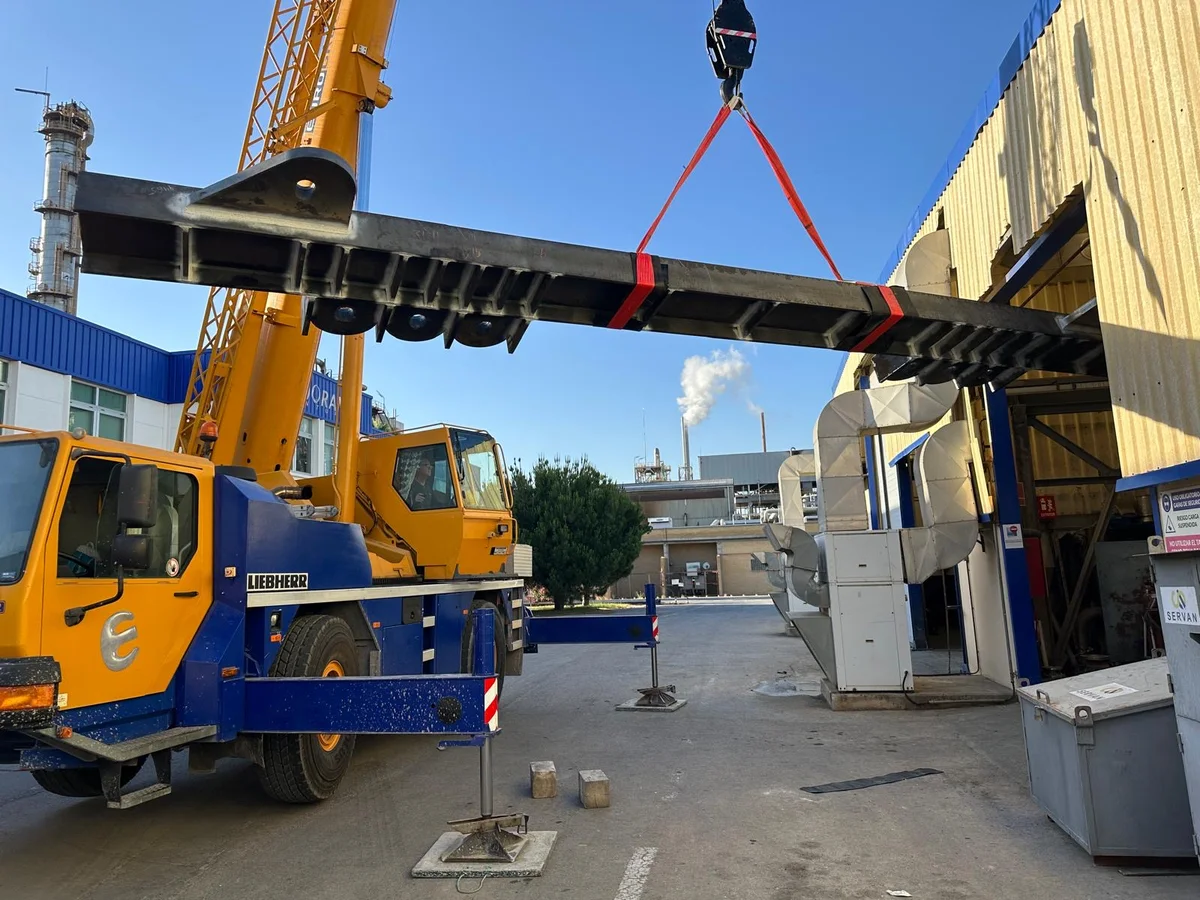 Para esta maniobra poco habitual, utilizamos dos balancines de 100 toneladas cada uno y contamos con la intervención de dos grúas de 500 y 350 toneladas cada una.